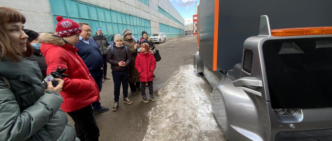 Посещение резидента технопарка ЭВОКАРГО – производителя Электрическго беспилотного грузовика EVO-1. Малотоннажный грузовик EVO-1 передвигается автономно благодаря техническому зрению с использованием камер. Он оснащен гибридной системой питания от электрических батарей и водородных топливных элементов.