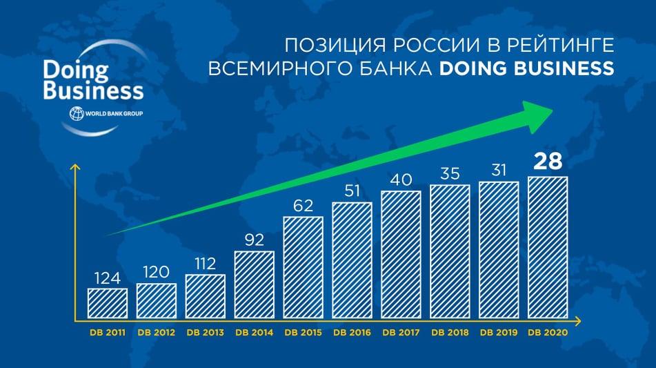 Президент РФ Владимир Путин еще в майских указах 2012 года поставил задачу достижения 20-й строчки в этом рейтинге к 2018 году, однако пока России не удалось выполнить эту задачу. В 2012 году Россия находилась на 120-м месте в рейтинге Doing Business.