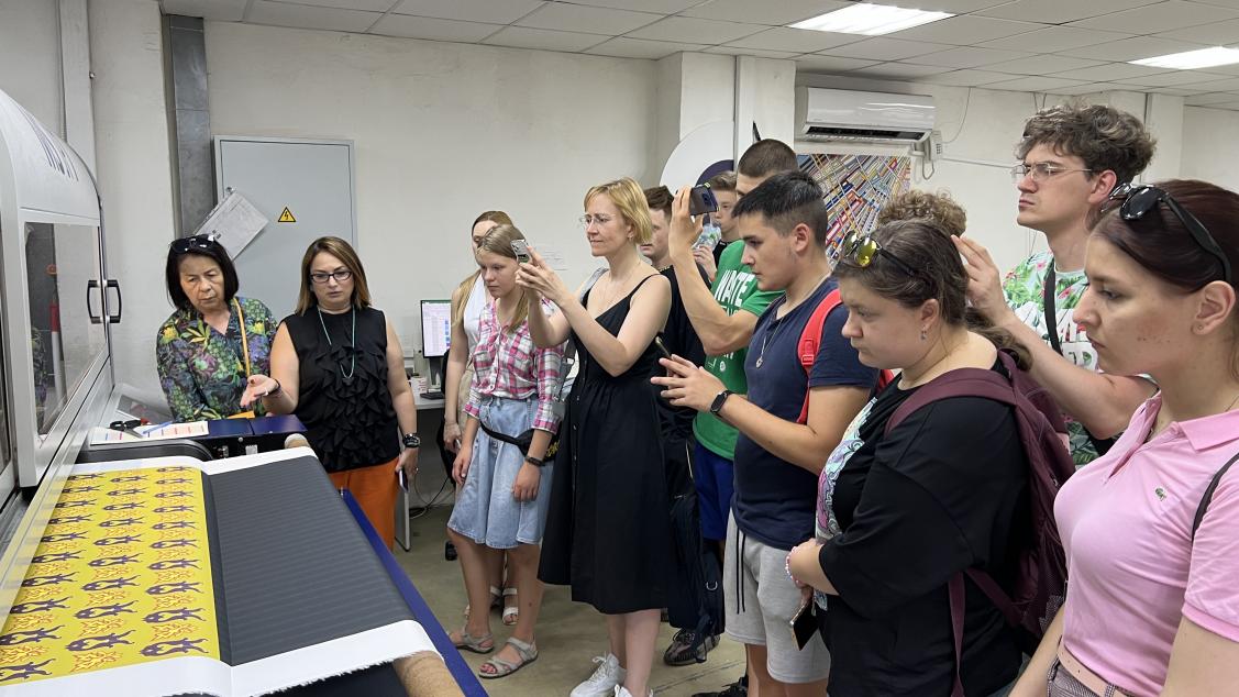 Далее экскурсионная команда посетила нашего самого яркого резидента – Солстудио! Фабрика цифровой печати на тканях заворожила гостей мероприятия оригинальными рисунками и современными технологиями, позволяющими наносить точный принт на полотна со скоростью 350 метров в час! Сотрудники Солстудио рассказали о том, как устроен мир моды, в каком направлении он развивается, и поделились прогнозами дизайнеров компании, которые и разрабатывают принты уже для 2025 года!
